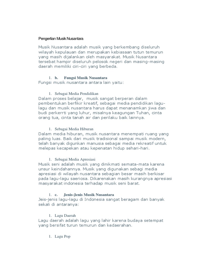 Pengertian, fungsi dan unsur seni musik. Musik nusantara adalah seluruh musik yang berkembang di nusantara ini, yang menunjukkan atau menonjolkan ciri keindonesiaan, baik dalam bahasa maupun gaya melodinya. Pengertian seni kata seni adalah sebuah kata yang semua orang di pastikan mengenalnya, walaupun dengan kadar pemahaman yang berbeda. Ragam musik nusantara yang berkembang dapat dibedakan menjadi musik tradisi, musik keroncong, musik dangdut, musik perjuangan, dan musik pop. Pengertian seni musik non tradisional, fungsi dan contohnya adalah uraian yang akan dibahas dalam materi pelajaran seni budaya dan keterampilan berikut ini.