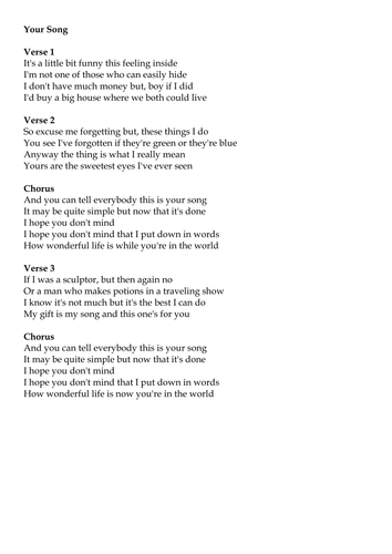 There is a video lesson for this song. If you are looking for a way to learn songs fast, guess the chords correctly when playing by ear, start writing your own songs or play your own solos you will like this one. D there i was a bm thought i had everything figured out g d goes to show just how much i know a g 'bout the way life plays out. Create and get +5 iq. The original key of your song is c. We have an official your song tab made by ug professional guitarists. Your song is considered under rock genre. Neatchords.com is here to be your ultimate musical resource. We are providing over 240'000 songs with chords and tablatures by 21'000 artists from all over the world. The songs are not listed in any particular order. Members can listen to and transpose the audio, watch the video tutorials, create and edit setlists, save favorites, add songs, and view the full lyrics and chord charts for all 12,000+ worship songs. Learn how to play exactly like elton john. 2 a there i was e f#m thought i had everything figured out d a goes to show just how much i know d e 'bout the way life plays out.